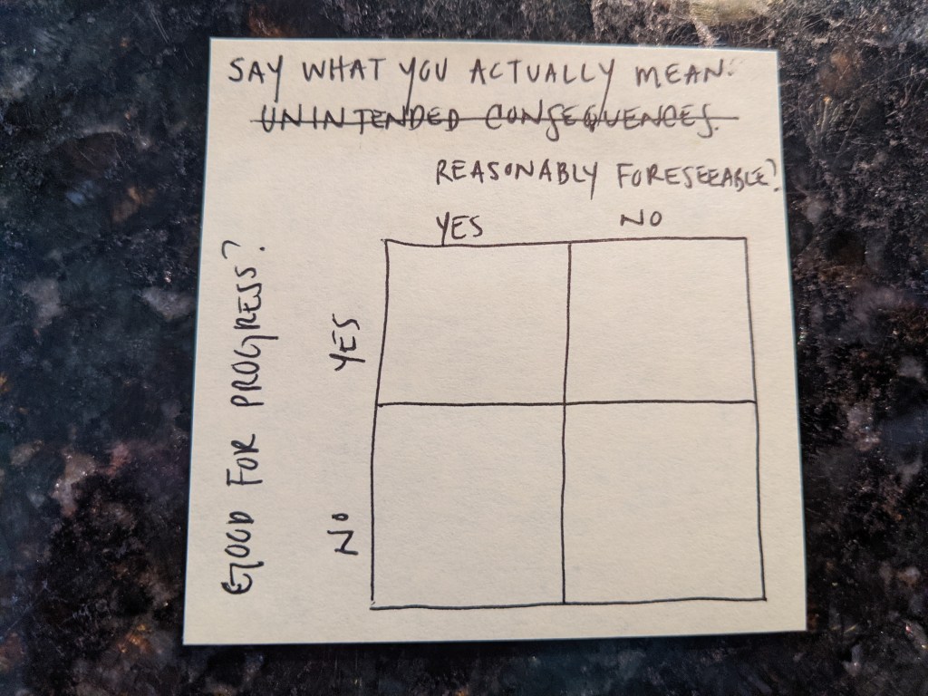 - SE quadtrant: Of course, some ‘bad’ things will happen that are not foreseeable even with a reasonable amount of thought and hindsight will always be 20/20 while foresight is not. Similar to the NE quadrant, it is easy enough to include one open-ended question about things that were challenging or bad. It may be the work of deeper, richer qualitative work to investigate this more if the issues are surfaced but one open-ended question on that matter will go a long way to more systematically understanding problems and harms.