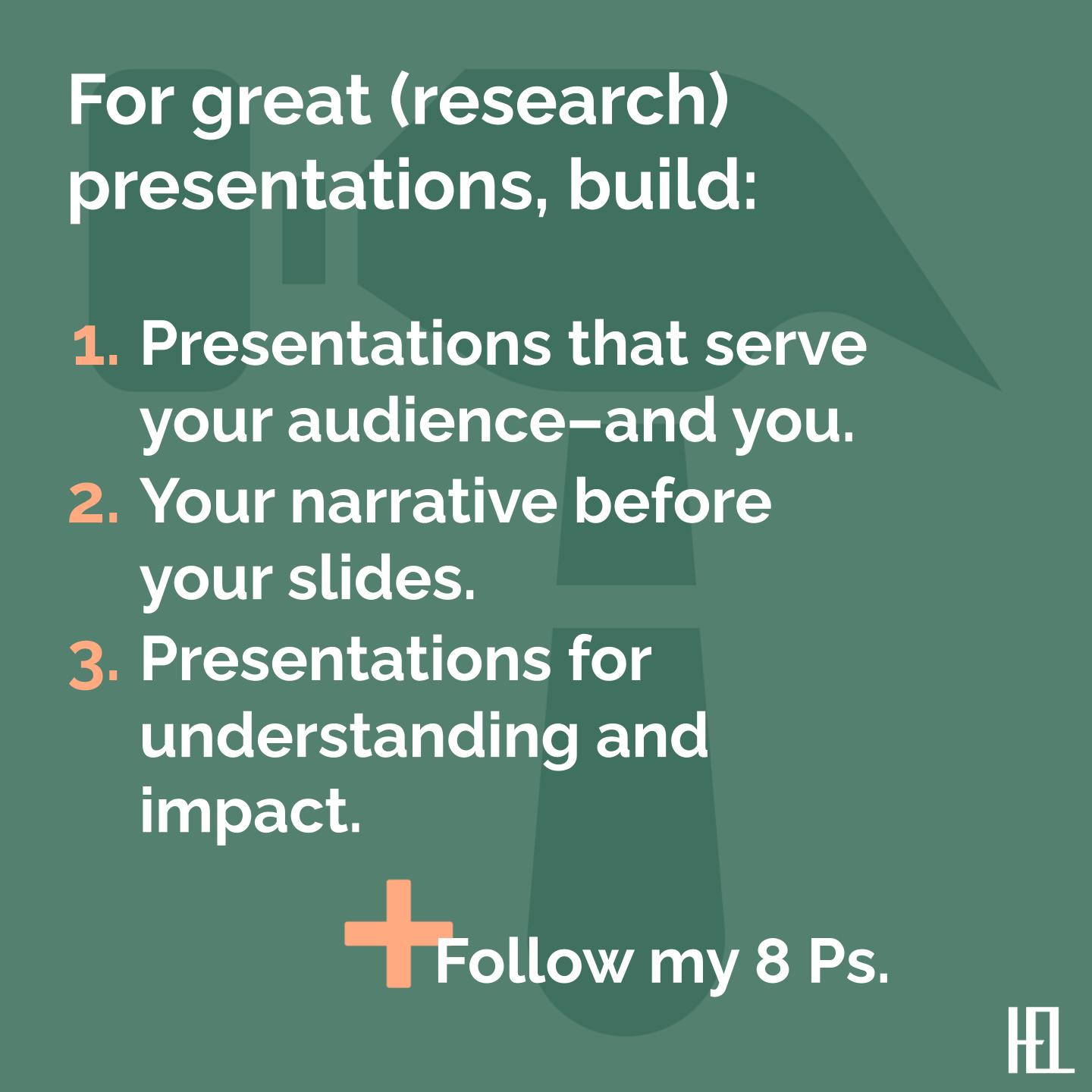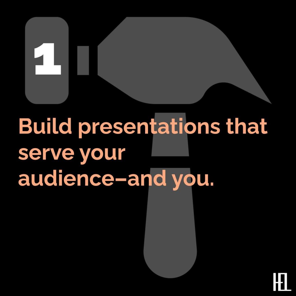 - Build presentations that serve your audience—and you. No one delivers—or listens to—presentations for their health.