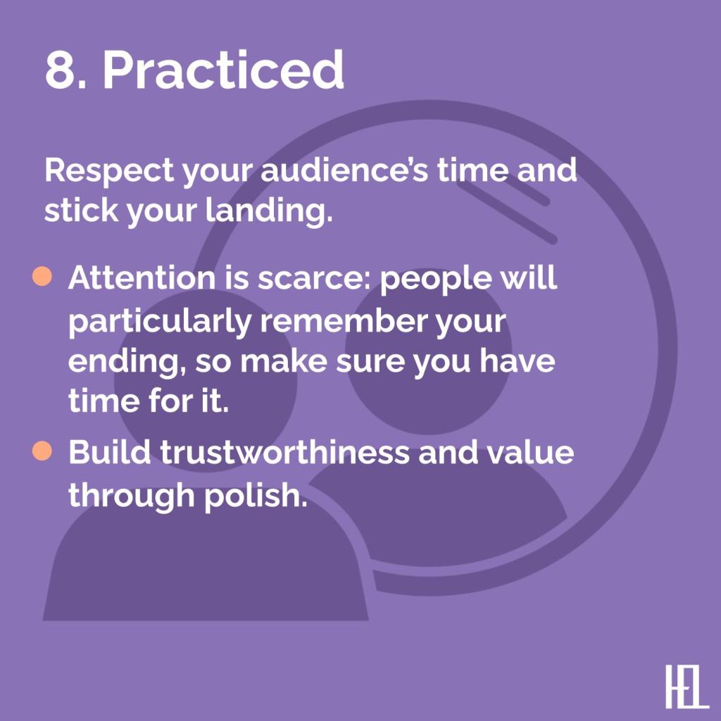 - Availability bias–Attention is scarce: people will particularly remember your ending, so make sure you have time for it and stick the landing.