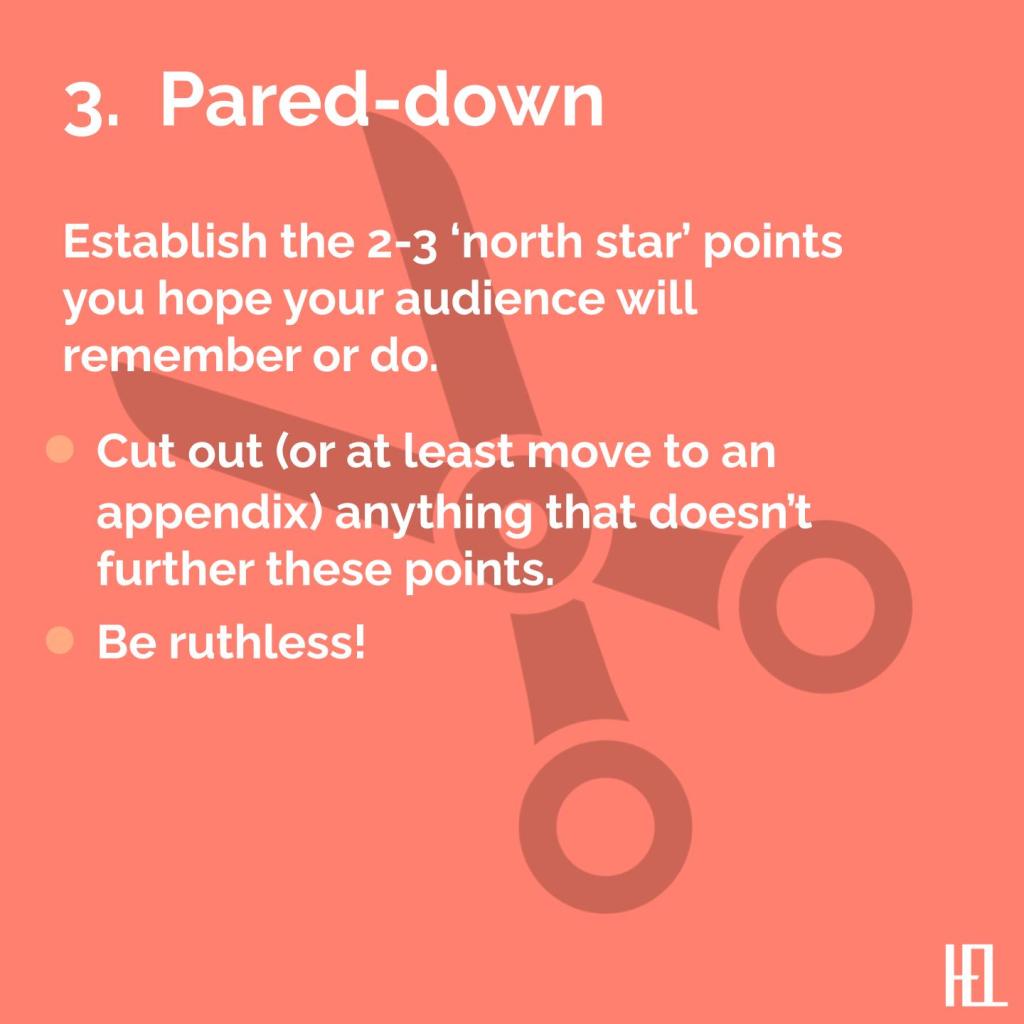 - Ruthlessly cut from your outline (since you started on paper, not in slides) to make sure everything supports these points and behaviors.