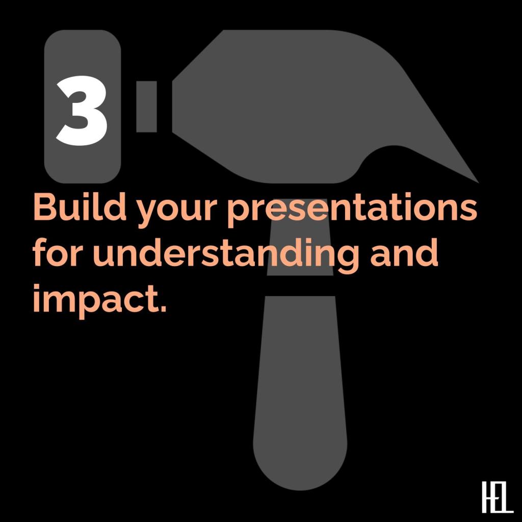 - Build presentations for understanding and impact. It’s not about everything you want to say, it’s about the key things you want your audience to understand, remember, and do.