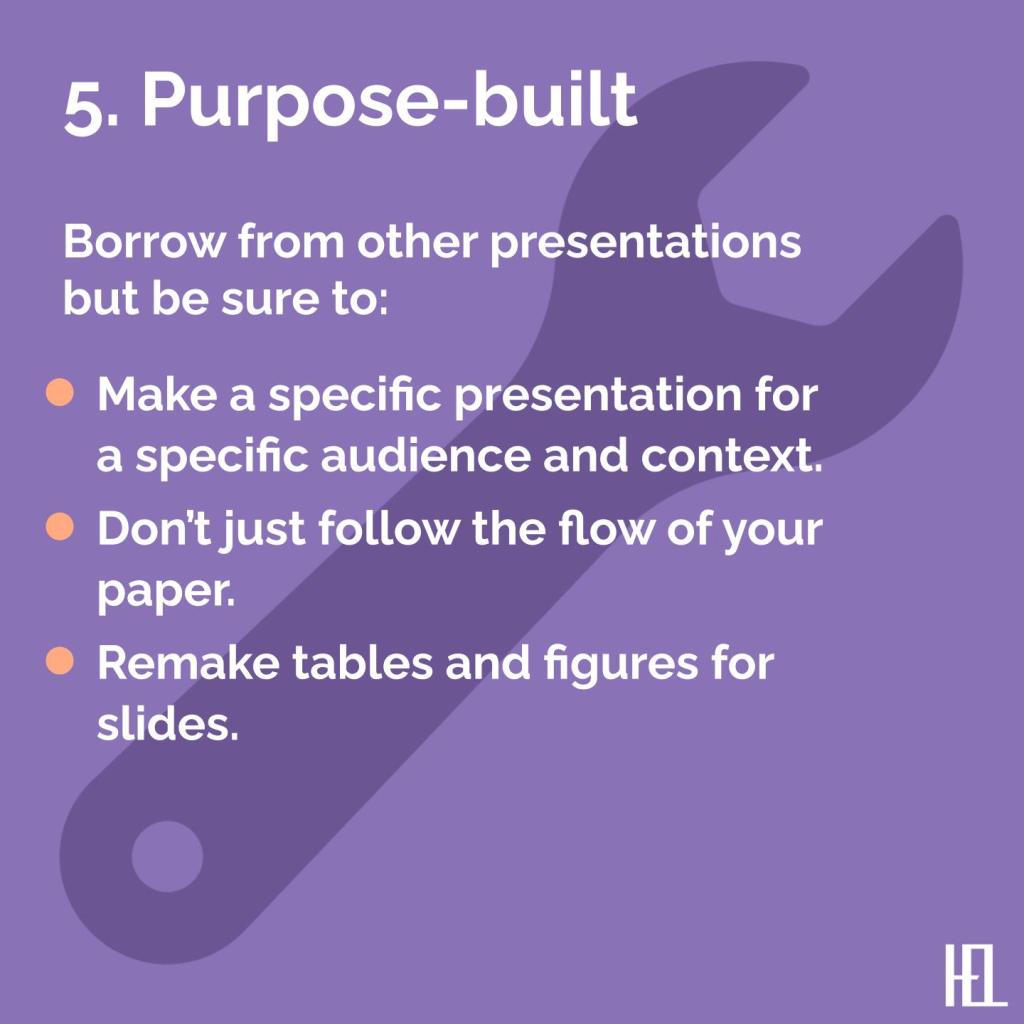 - Remake tables and figures especially for slides. Favor figures over tables. If you need people to see a lot of detail, provide a (virtual) handout.